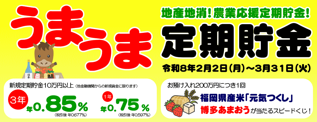 2026年02月02日 「地産地消!農業応援定期貯金!うまうま定期貯金」を発売しました 2026年01月08日 福岡県農業信用基金協会保証ネットローンの取扱いについて 2026年01月06日 システムメンテナンスに伴うATM稼働時間の変更についてPDF